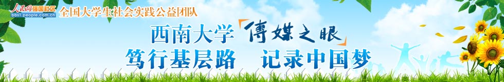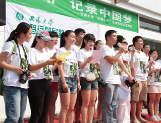 西南大學(xué)“傳媒之眼”社會(huì)實(shí)踐隊(duì)由新聞傳媒學(xué)院團(tuán)委老師李海峰、范曦帶隊(duì),8名研究生、19名本科生組成。團(tuán)隊(duì)圍繞“篤行基層路,記錄中國夢”的主題,自7月3日開始,從建設(shè)生態(tài)北碚、“百姓中國夢”主題宣講、“幸福重慶”人文記錄、“山城百姓”社會(huì)調(diào)查四個(gè)方面開展活動(dòng)。團(tuán)隊(duì)已經(jīng)在歇馬鎮(zhèn)碚青路中心廣場舉行了文藝匯演,并給群眾帶來了各種各樣的避暑藥品;到歇馬污水處理廠,了解當(dāng)?shù)厣a(chǎn)生活污水的處理;到重慶歇馬機(jī)械曲軸有限公司,宣傳“節(jié)能生產(chǎn)”理念,在員工中開展環(huán)保培訓(xùn),強(qiáng)調(diào)可持續(xù)生產(chǎn)和發(fā)展。