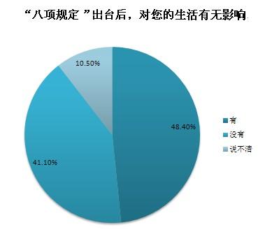 截至2013年12月20日10時(shí),共收到網(wǎng)絡(luò)問(wèn)卷2442份,48.4%的受訪(fǎng)者認(rèn)為“八項(xiàng)規(guī)定”對(duì)個(gè)人生活有影響,其中公務(wù)員群體認(rèn)為“八項(xiàng)規(guī)定”帶來(lái)的最大影響是“公務(wù)吃請(qǐng)少了,能抽出更多時(shí)間陪伴家人”和“津貼補(bǔ)貼獎(jiǎng)金少了,勒緊褲帶過(guò)日子”,非公務(wù)員群體認(rèn)為“八項(xiàng)規(guī)定”帶來(lái)的最大影響是“酒店、高端會(huì)所門(mén)外的公務(wù)用車(chē)少了”和“遇到領(lǐng)導(dǎo)考察工作時(shí),地毯鮮花迎送領(lǐng)導(dǎo)的情況少了”。