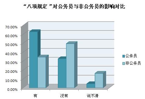 “八項(xiàng)規(guī)定”出臺(tái)后,對(duì)您的生活有無(wú)影響?”針對(duì)這一題,48.4%的受訪(fǎng)者選擇“有影響”,41.1%選擇“無(wú)影響”,10.5%“說(shuō)不清”。從調(diào)查結(jié)果來(lái)看,“八項(xiàng)規(guī)定”對(duì)公務(wù)員群體的影響大于非公務(wù)員群體,受訪(fǎng)者中分別有62.8%的公務(wù)員和34.4%的非公務(wù)員選擇了“有影響”,前者比后者多28.4%。但是,回答“說(shuō)不清”的比例,后者(16.2%)高于前者(4.6%),表明普通民眾相比于公務(wù)員對(duì)“八項(xiàng)規(guī)定”是否影響個(gè)人生活的認(rèn)知相對(duì)模糊。