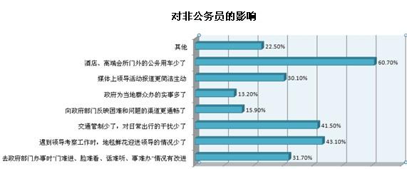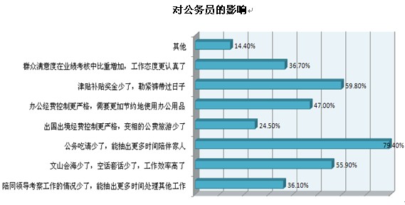 還有三到五成受訪(fǎng)公務(wù)員認(rèn)為“辦公經(jīng)費(fèi)控制更嚴(yán)格,需要更加節(jié)約地使用辦公用品”、“群眾滿(mǎn)意度在業(yè)績(jī)考核中比重增加,工作態(tài)度更認(rèn)真了”和“陪同領(lǐng)導(dǎo)考察工作的情況少了,能抽出更多時(shí)間處理其他工作”是“八項(xiàng)規(guī)定”帶來(lái)的幾大影響。