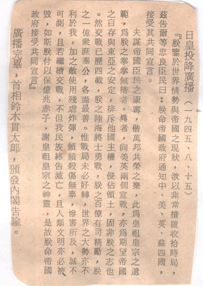 1945年8月15日日本天皇投降廣播詞。這篇文告是告訴自己的老百姓(忠良臣民)的。其中對于發(fā)動戰(zhàn)爭的罪責不但沒有一個字的自責,而且指“敵使用殘虐炸彈,頻頻殺傷無辜,慘害所及,誠不可測。”和十余年后所發(fā)現(xiàn)的東條英機遺囑的惡劣態(tài)度如出一轍。廣大網(wǎng)友不放回頭看看2013年12月12日18:21:31《歷史鐵證日本400年侵華野心,讓我們恨搗靖國神社內(nèi)幕吧!》一文中東條英機的遺囑。
