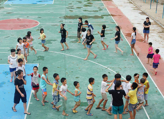志愿者與孩子們?cè)诓賵?chǎng)做游戲