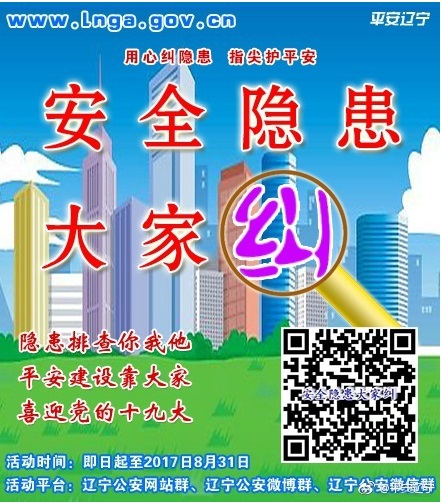 為深入貫徹落實習(xí)近平總書記系列重要講話精神,充分發(fā)揮全省“網(wǎng)上公安機關(guān)”平臺作用,遼寧省公安廳從即日起至8月31日,組織全省公安機關(guān)依托各級公安政務(wù)網(wǎng)站、公安政務(wù)微博、公安政務(wù)微信平臺,集中開展“安全隱患大家糾”活動,全面開啟遼寧公安“查患治患”工作的“互聯(lián)網(wǎng)+”模式。