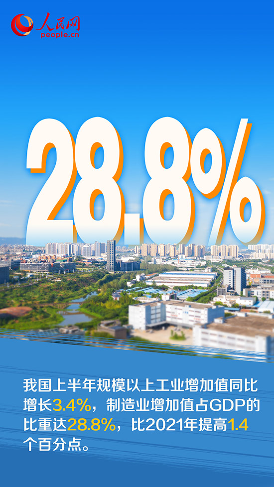 上半年,在各地區(qū)各部門共同努力下,盡管面臨疫情沖擊,產(chǎn)業(yè)鏈供應(yīng)鏈日益穩(wěn)定暢通,工業(yè)經(jīng)濟(jì)迅速扭轉(zhuǎn)了下滑態(tài)勢,實現(xiàn)了恢復(fù)增長。國新辦7月19日舉行發(fā)布會介紹,今年上半年,我國規(guī)模以上工業(yè)增加值同比增長3.4%,規(guī)模以上制造業(yè)增加值同比增長2.8%,制造業(yè)增加值占GDP的比重達(dá)28.8%,比2021年提高1.4個百分點(diǎn)。