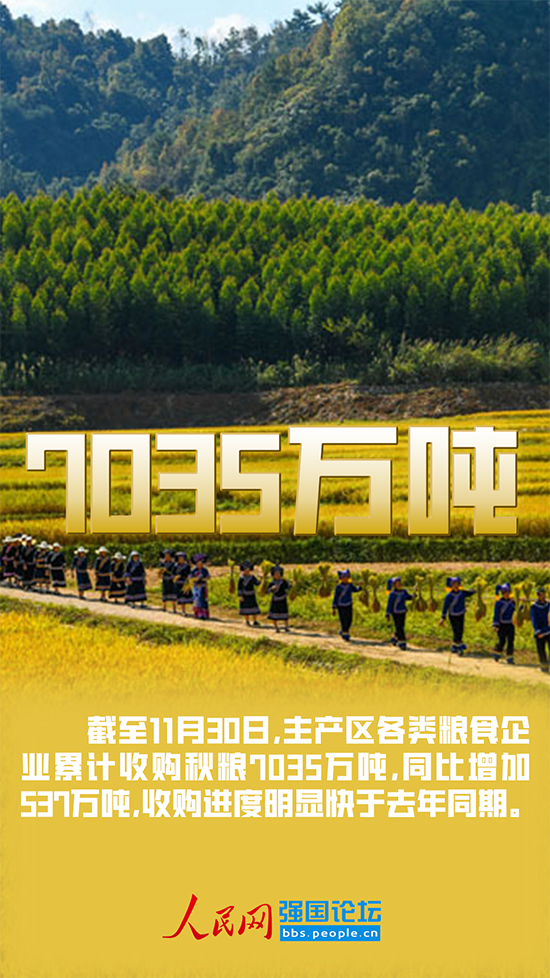 隨著各地大規(guī)模秋收結(jié)束,秋糧開始集中上市交易。據(jù)國家糧食和物資儲備局最新發(fā)布,截至11月30日,主產(chǎn)區(qū)各類糧食企業(yè)累計收購秋糧7035萬噸,同比增加537萬噸,收購進(jìn)度明顯快于去年同期!跋啾扔2021年、2020年、2019年的6498萬噸、6803萬噸、5614萬噸,與歷年同期相比,今年達(dá)到了近年來糧食企業(yè)秋糧收購數(shù)量的最高值!崩钚潞Uf道。