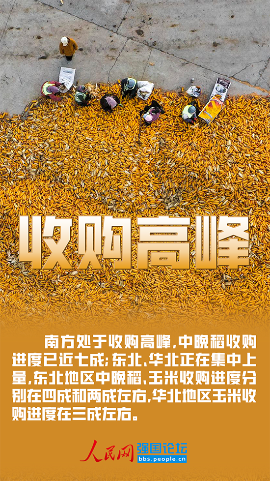 當(dāng)前,南方處于收購高峰,中晚稻收購進(jìn)度已近七成;東北、華北正在集中上量,東北地區(qū)中晚稻、玉米收購進(jìn)度分別在四成和兩成左右,華北地區(qū)玉米收購進(jìn)度在三成左右。
