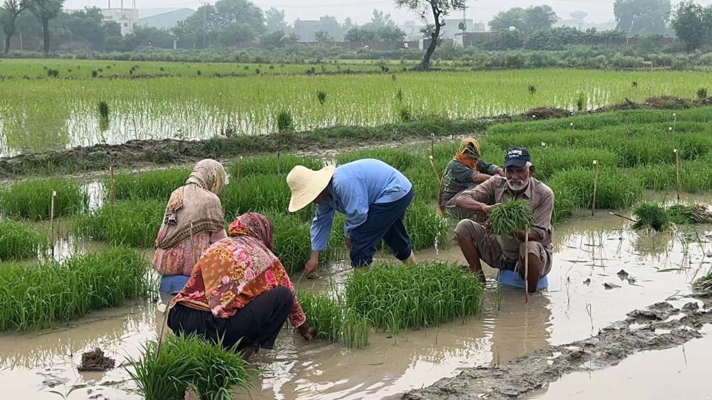 龍春久教授(中)與巴基斯坦當?shù)剞r民在拉合爾隆平南亞種子研發(fā)中心試驗田里忙碌著。(人民網記者 周晶攝)